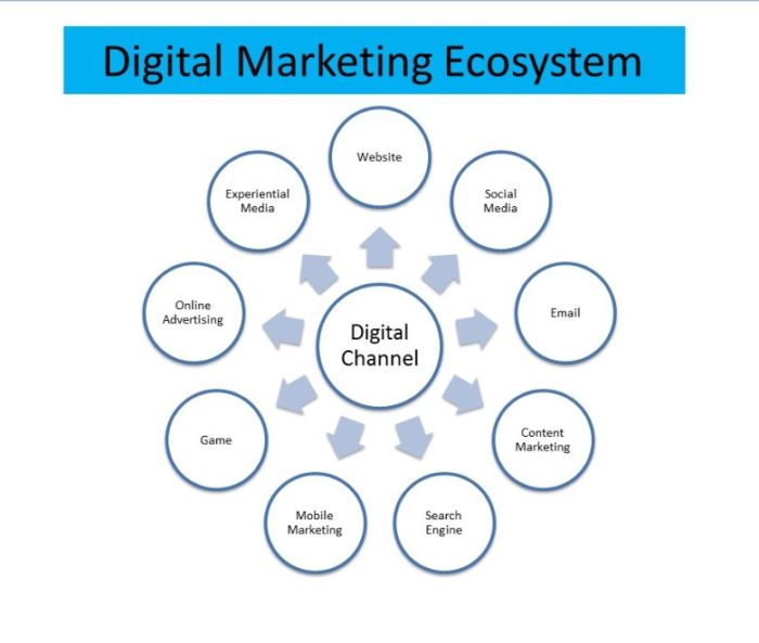Berikut ini adalah Ekosistem Digital Marketing yang akan dijelaskan oleh beliau, yang meliputi : Content Marketing, Search Engine, Online Advertising, Experiential Media, Website/laman/situs, Sosial Media, Email, Mobile Marketing, Game. Dan tentunya semuanya bisa digunakan oleh Online Marketers dalam memasarkan semua produk juga jasa yang dijual.